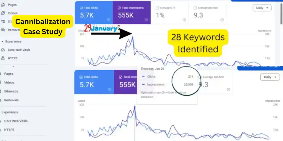 This overlap was further confirmed through Google Search Console data, where the same queries were generating impressions and clicks for more than one URL. These findings are based on real-life website data and actual performance metrics. The examples discussed here reflect real site scenarios, showing how keyword competition can impact rankings and overall organic traffic visibility.
