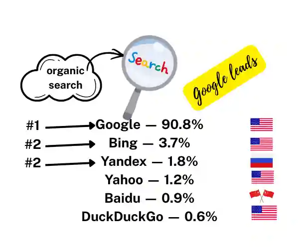 According to the latest global data, Google dominates the search engine market with about 90% share, making it by far the most used search engine worldwide. Other search engines include Bing (around 3.7%), Yandex (about 1.8%), Yahoo! (around 1.2%), Baidu (about 0.9%) and DuckDuckGo (about 0.6%). This highlights Google’s overwhelming position in global web search