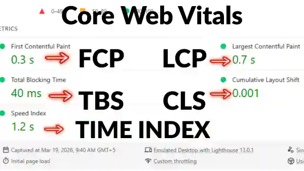 Technical part of search engine optimization is the foundation of your website. Think of it like the structure of a house. If the foundation is not strong, the house cannot stand properly. The five core web vitals are most important factors for site speed optimization, as in picture